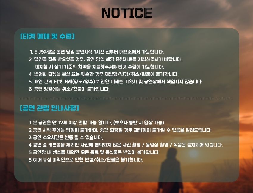 ⑥ 공연 당일(당일 구매 포함)은 취소, 환불, 변경이 불가합니다.