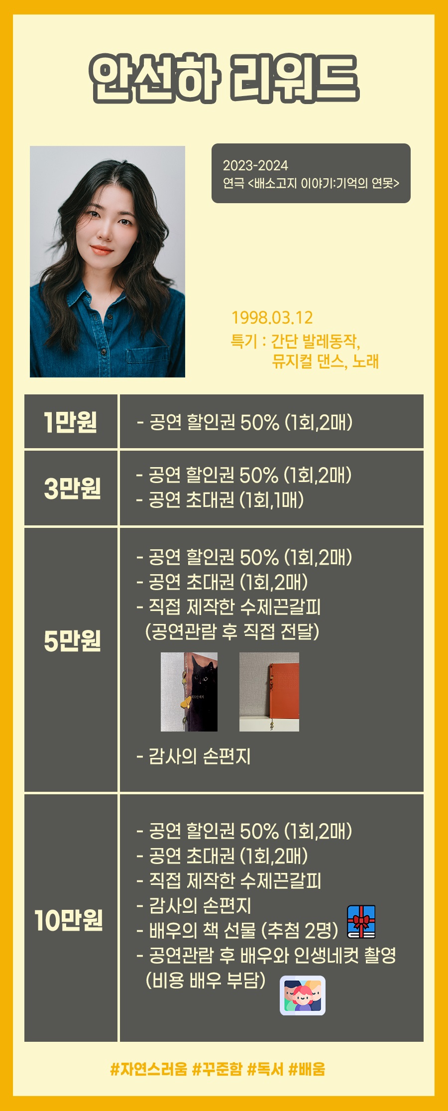 안녕하세요 안선하입니다. 평소에는 읽고 쓰는 것을 좋아해 책을 읽거나 일상의 생각들을 적어대며 무척 잔잔하고 지루한 일상을 보내는 편입니다. 특별한 캐릭터는 없지만 내면을 키우면 그것이 켜켜히 쌓여 곧 캐릭터가 되리라 생각하고 살고, 또 연극하고 있습니다. 무색무취의 배우로 시작해 어떠한 철학과 이야기든 다 받아들이는 배우로 성장하고 싶습니다. 그런 저의 한걸음 한걸음을 응원해주세요! Q. 쉬는 날에 취미는? A. 카페가서 책과 필사 Q. 나에 대한 한줄 소개? A. 괴로워도 정진한다 |