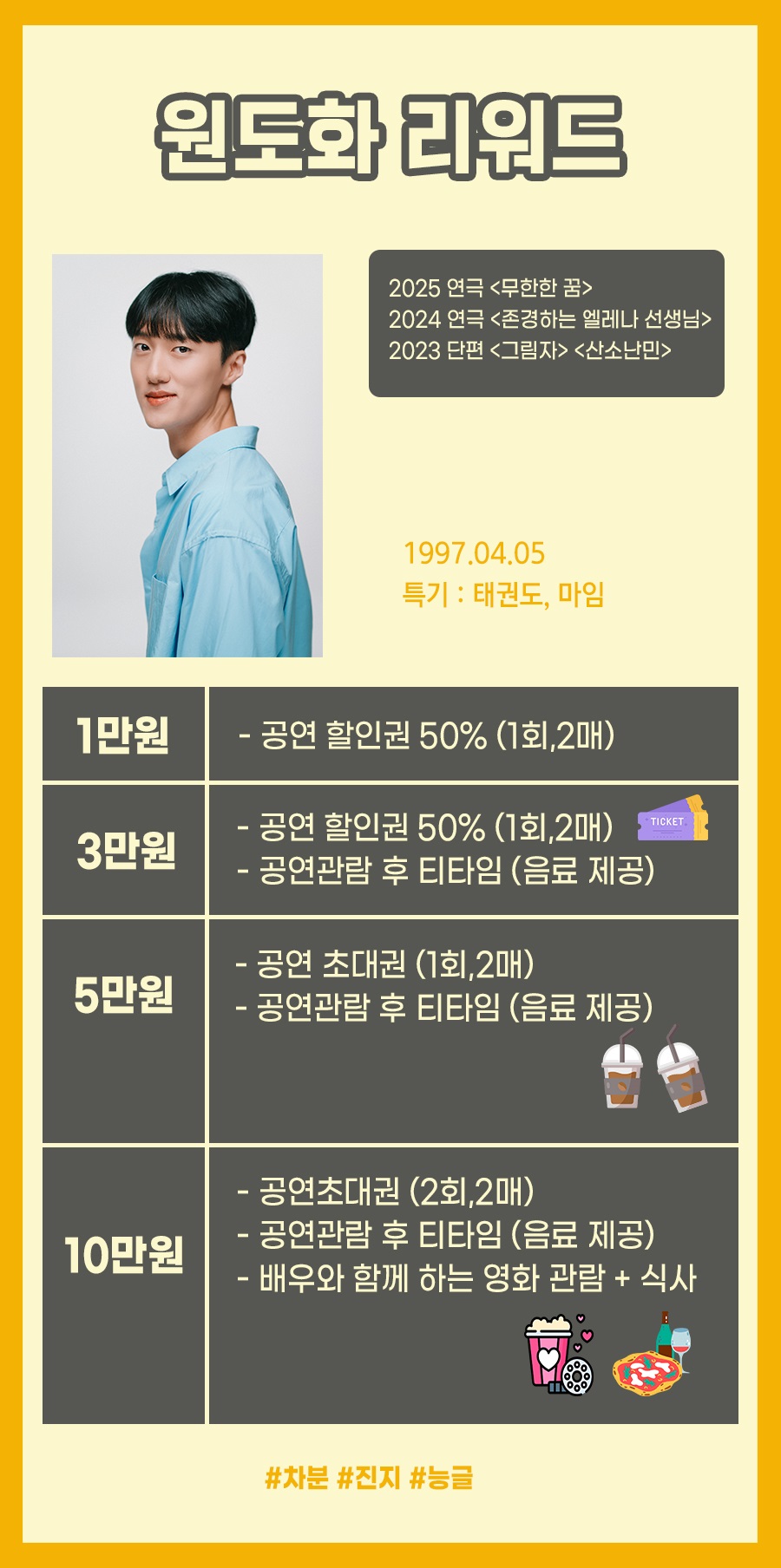 저는 선과 악의 얼굴을 가진 원도화입니다. 웃음과 정색으로 두 캐릭터성을 보여드릴 수 있습니다. 좋은 과정 끝에 좋은 결과가 있다고 믿습니다. 최종적으로 소비하는 관객분들도 매우 소중하고, 현장에서 같이 작업하는 모든 분들과도 좋은 과정을 겪으며 같이 작업하고 싶어지는 배우가 꿈입니다. 앞으로 잘 부탁드립니다! Q. 자신있는 연기는? A. 자연스런 일상연기 Q. 쉬는날에 취미는?! A. 하루종일 침대위에 Q. 참여해본 소감은? A. 끼워줘서 고마워요 |