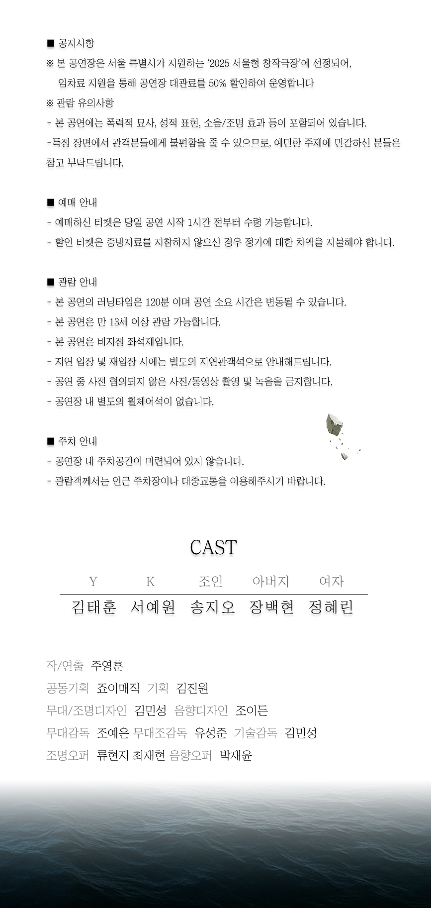 ※ 관람 유의사항 - 본 공연에는 폭력적 묘사, 성적 표현, 소음/조명 효과 등이 포함되어 있습니다. 특정 장면에서 관객분들에게 불편함을 줄 수 있으므로, 예민한 주제에 민감하신 분들은 참고 부탁드립니다.
