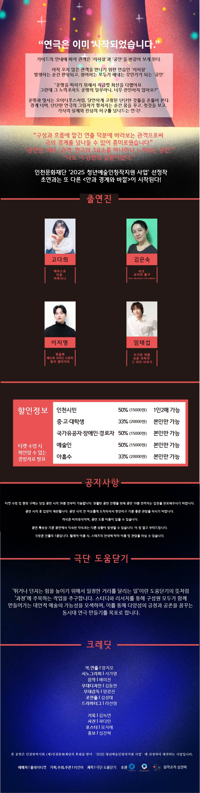 - 공연 특성상 기존 공연에서 익숙한 약속과는 다른 상황이 발생할 수 있습니다. 이 점 참고 부탁드립니다.