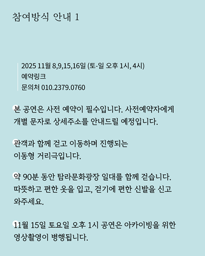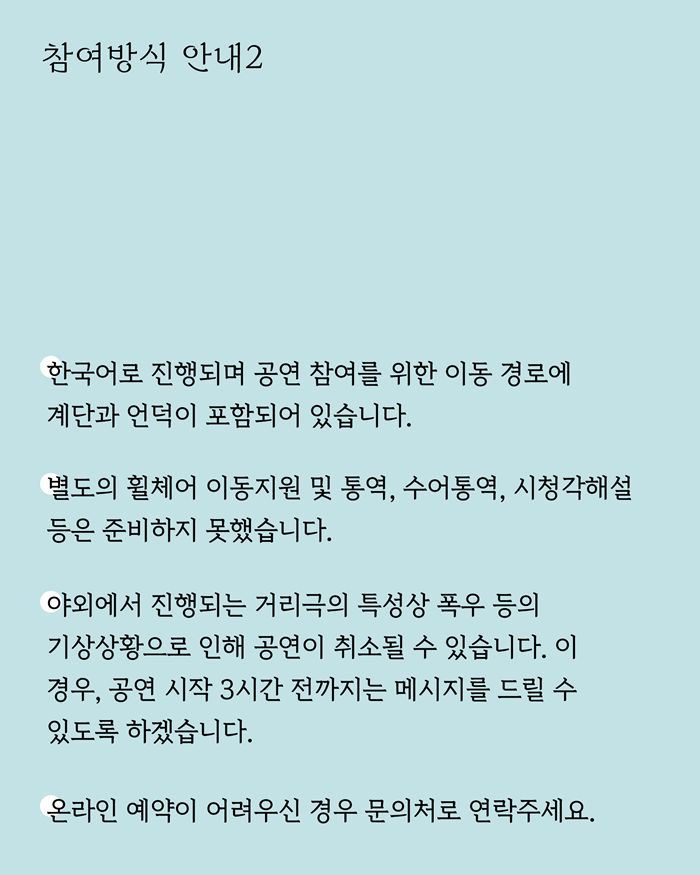 ⑪ 무료예약공연의 경우, 예약과 취소요청에 신중을 기해주시기 바랍니다. 예약과 취소의 잦은 반복으로 인한 제한을 받으실 수 있습니다.