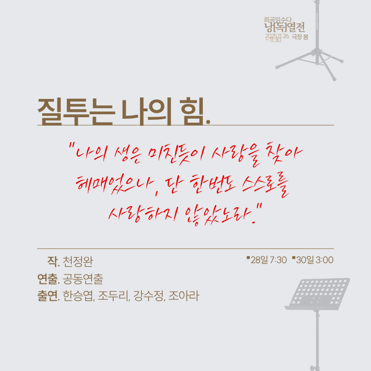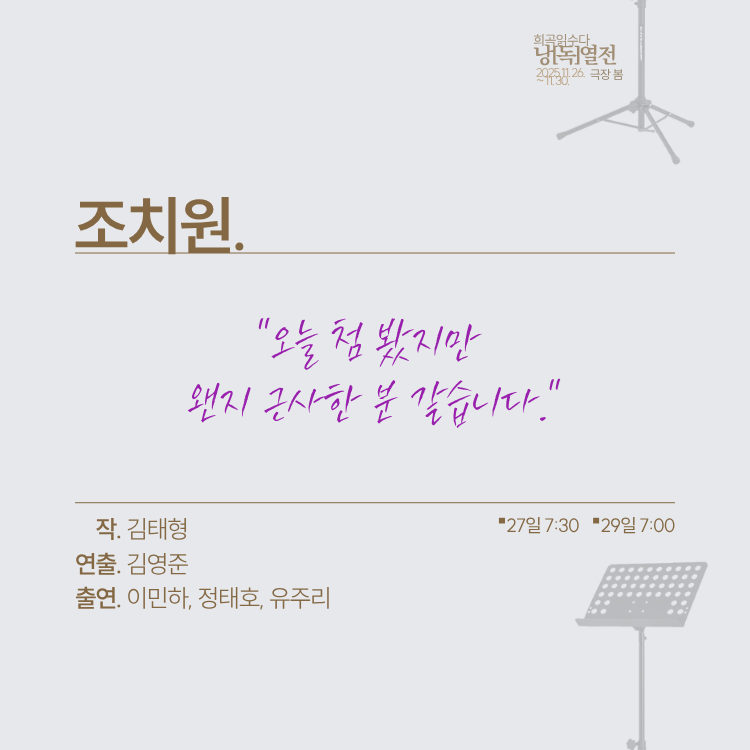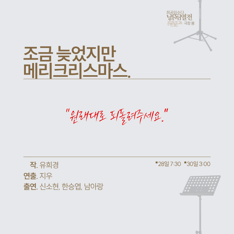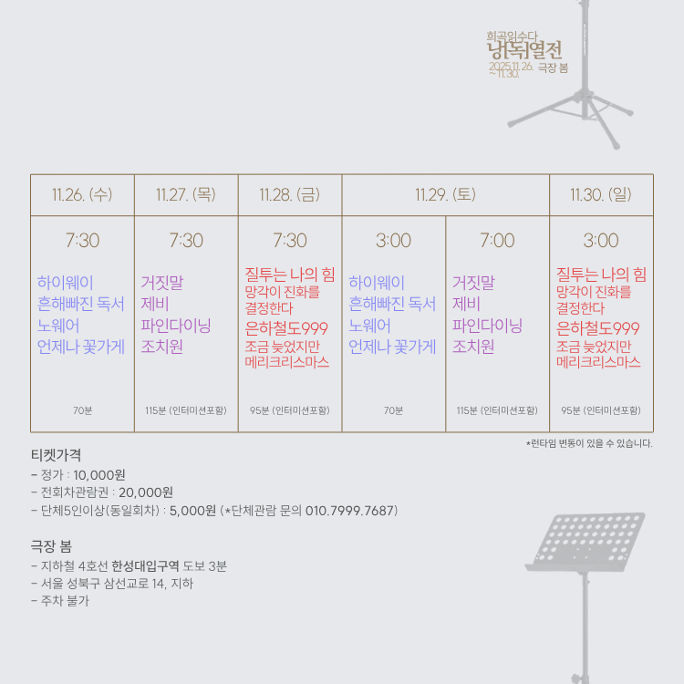 ⑤ 블루(11/26(수) 7:30, 11/29(토) 3:00) 팀의 공연은 지연입장이 없으며, 퍼플 팀과 레드 팀의 경우 인터미션에만 지연입장이 가능합니다.