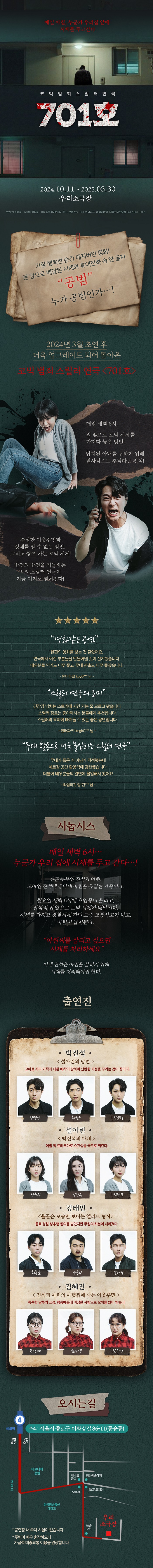 연극 > 대학로 701호 [판매중] 조회수 49 공연명 701호 공연지기 팀플레이예술기획(주) 가격 기본가 전석 12,000원 기간 25-12-01 ~ 25-12-31 장르 연극 장소 우리소극장 관람등급 중등(만 13세 이상) 관람시간 90분 문의번호 1661-6981 출연진 스태프 예매하기 URL 복사