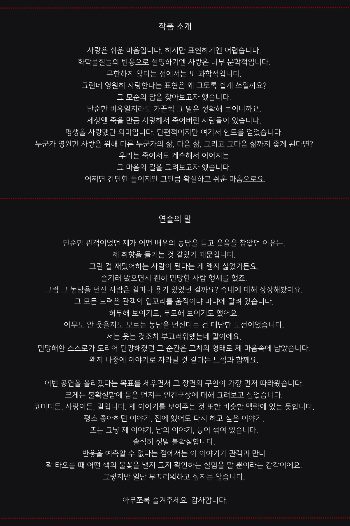 * 본 공연은 러닝타임 100분이며, 인터미션이 없습니다.