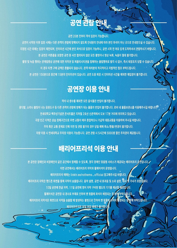 ⑤ 공연장 내 음식물 반입(물, 음료 포함) 및 사진촬영이 금지되어 있습니다.