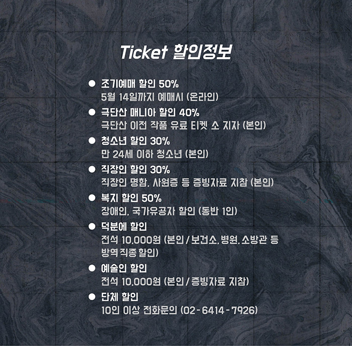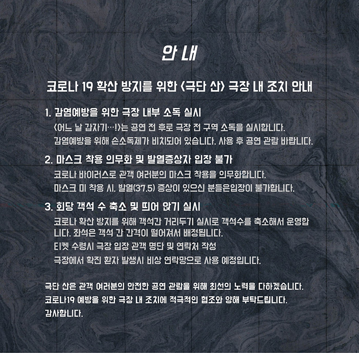 연극 > 대학로 어느 날 갑자기…! [판매마감] 조회수 3994 공연명 어느 날 갑자기…! 공연지기 san1010 가격 기본가 전석 30,000원 기간 21-06-03 ~ 21-06-13 장르 연극 장소 대학로 예술공간 혜화 관람등급 만 15세 이상 관람시간 90분 (인터미션 없음) 문의번호 02) 6414 7926 출연진 스태프 예매하기 URL 복사
