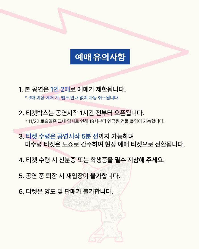 5. 티켓 수령은 공연 시작 5분 전까지 가능하며, 수령하지 않은 티켓은 노쇼로 간주하여 현장 예매 티켓으로 전환됩니다.